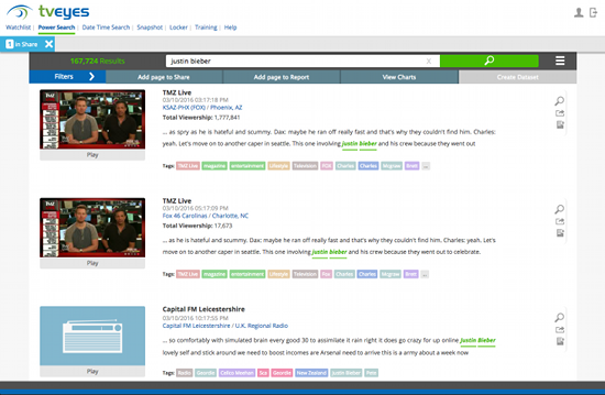 TVEyes allows you to have “eyes” out in public all the time to know when relevant content is airing on television across the country. It’s very versatile and easy enough that we’ve had short term interns come in and learn it.